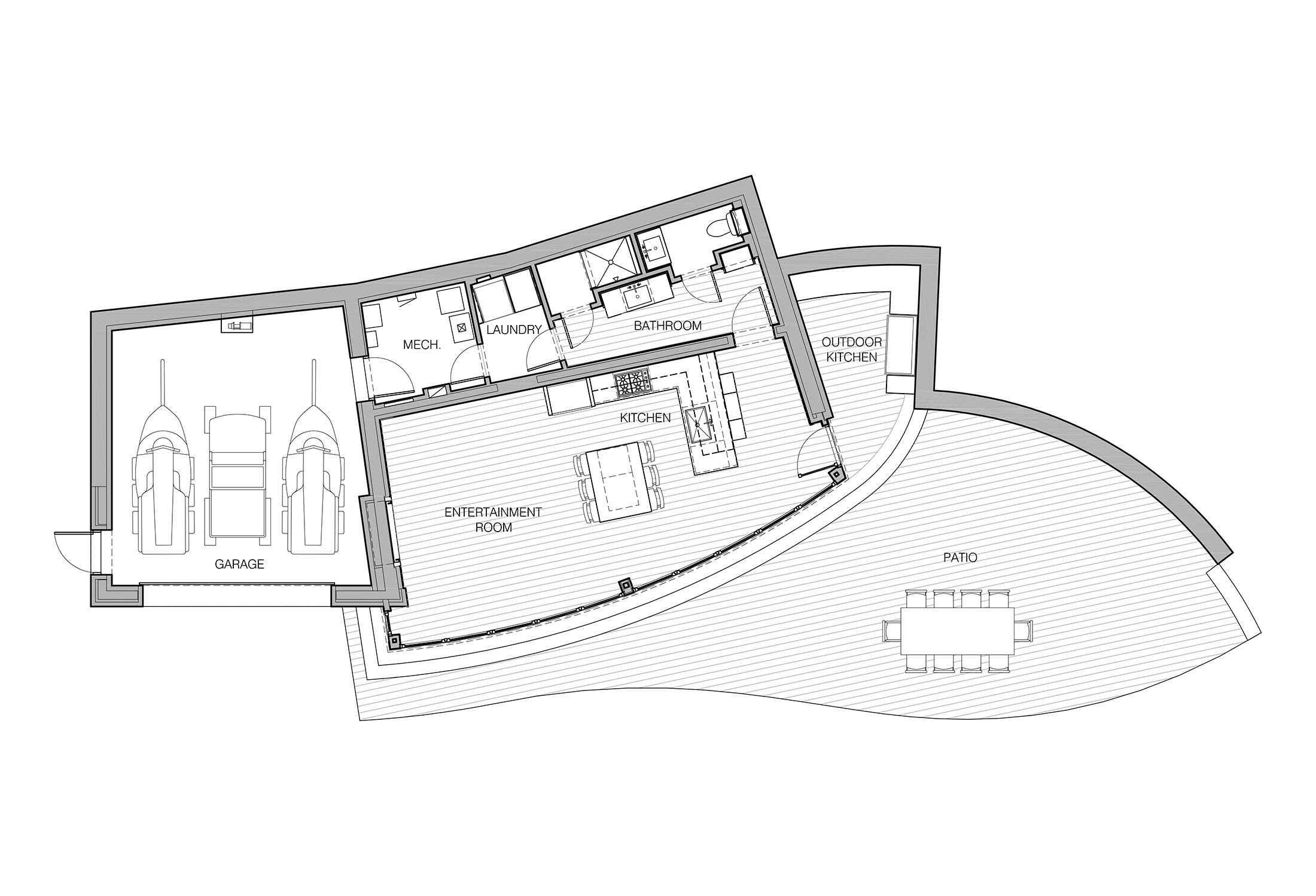 Sweeping curved forms create a beachfront retreat for the family to enjoy and entertain with a large expanse of Ipe wood deck, a Family Room, a full gourmet Kitchen, a Bathroom and a large Garage for beach toys and vehicles. An operable panel window wall system that spans across the entire living space allows the interior space to be completely opened up to the exterior landscape.