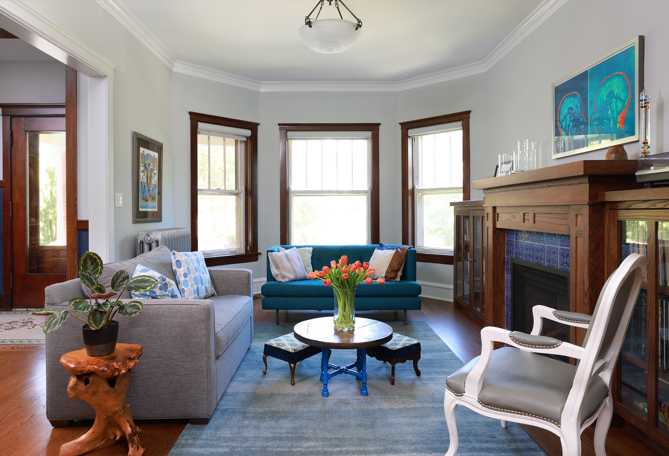 Splashes of color energize this flat without losing it's vintage character. The Foyer was delicately reworked to retain the original tile floor while converting it from a cramped apartment entry to an open, inviting stair hall.